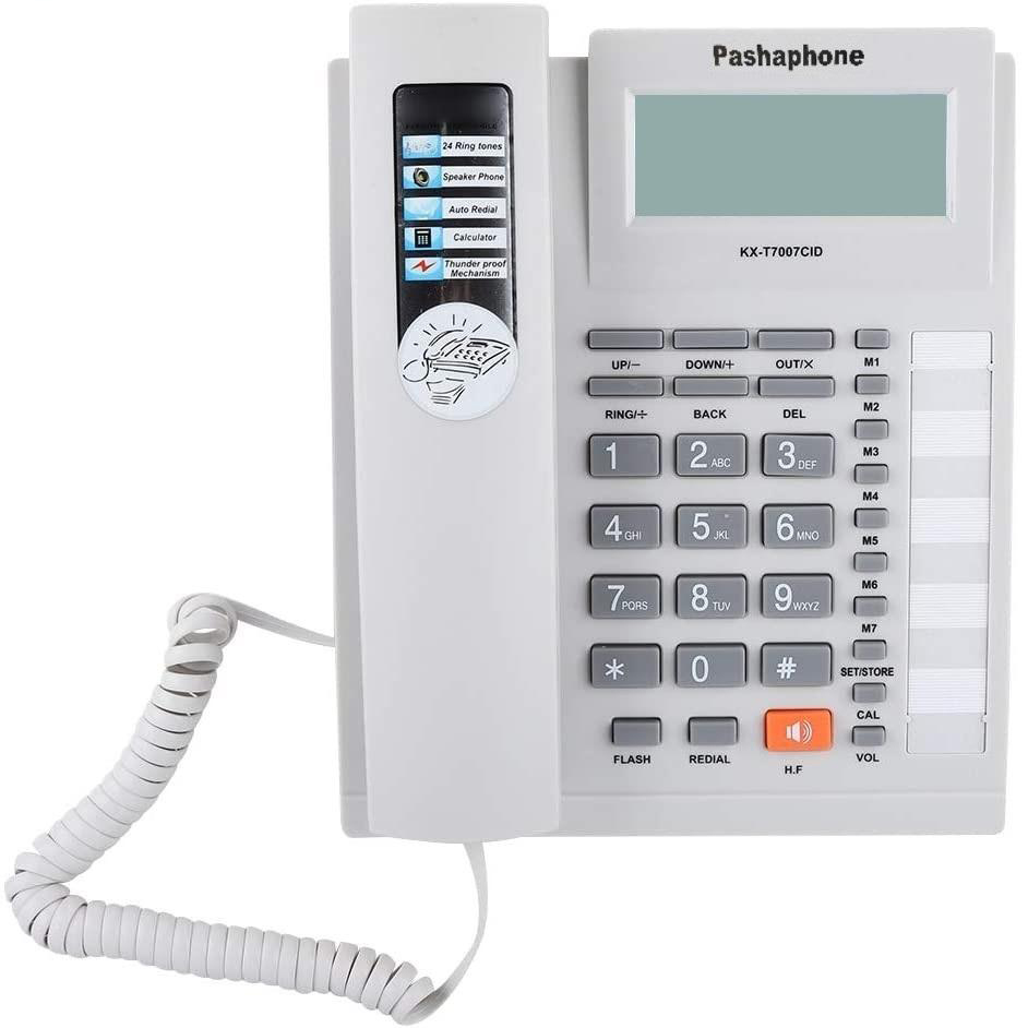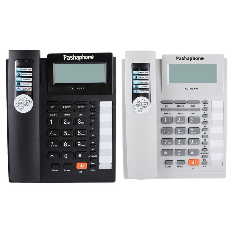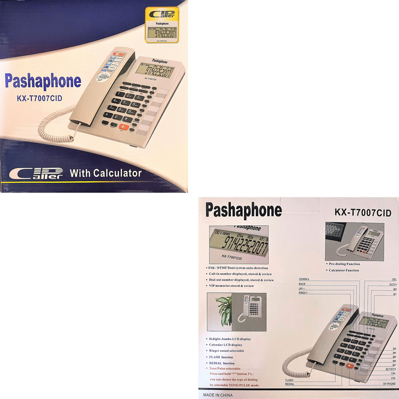 تلفن رومیزی پاشافون مدل KX-T7007CIDبهره گیری از متریالی پلاستیکی جهت ساخت بدنه، مقاوم در برابر فشار و ضربه پشتیبانی از دو خط اتصال و سازگار با CallerID از نوع سیستم دوگانه FSK و DTMF.ثبت ۶۱ تماس ورودی و ۱۶ تماس خروجی جهت بازبینی مجدد، نمایش ساعت و تاریخ.شماره گیری به دو روش تن و پالس، نمایشگری خوانا با قابلیت نمایش حداکثر ۱۶ رقم.امکان انتخاب شدت صدا و آهنگ زنگ، تکرار اتوماتیک آخرین شماره گرفته شده (Redial).مجهز به اسپیکر داخلی قدرتمند و ماشین حساب، امکان ذخیره ۷ شماره برای تماس سریع